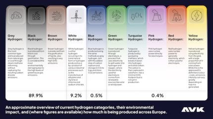 Hydrogen fuel is classified into different types based on its production method and resulting environmental impact, often denoted by colour codes. The table above gives an approximate overview of the current categories, their environmental impact, and (where figures are available) how much, percentage wise, is being produced across Europe.